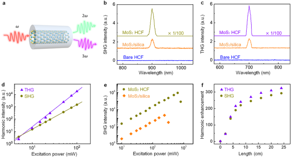 中国科学院物理研究所/北京凝聚态物理国家研究中心白雪冬课题组,中科院院士、北京大学教授刘忠范,北京大学研究员刘开辉合作,提出一种液相辅助两步化学气相沉积法在多孔光纤孔内壁上直接生长二维过渡金属硫族化合物,制备出具有超高非线性的二维材料复合光纤。该方法解决二维材料前驱体在大纵横比光纤中传质不匀的问题,实现多种二维材料及其合金在不同种类规格光纤(空心石英管光纤和光子晶体光纤等)中均匀全覆盖生长,长度可达25 cm。在此基础上,研究人员基于复合光纤的非线性实部和虚部分别进行应用研究:(1)非线性实部:光频转换应用研究。实验发现,二维材料复合光纤展示出较强的二次和三次谐波产生,相比于平面石英衬底上的MoS2样品,该MoS2复合光纤的非线性信号增强~300倍,损伤阈值提高3倍,传输损耗仅为~0.1 dB/cm。(2)非线性虚部:全光纤超快脉冲激光器的研究。将MoS2复合光纤用作饱和吸收器,完成全光纤锁模脉冲激光器的搭建和测试,具备超窄脉冲宽度~500 fs高重复频率~41 MHz等性能。