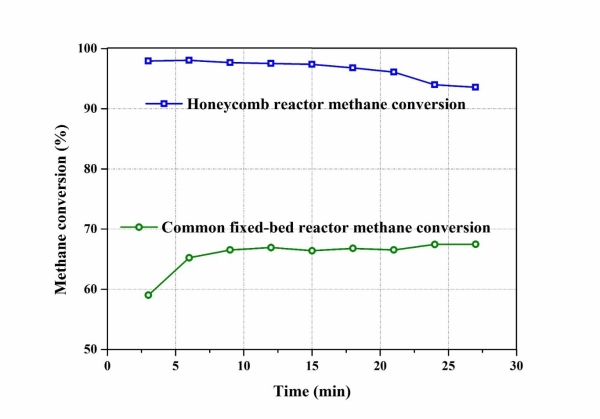 为进一步提高循环反应性、降低反应温度,研究人员从反应分离及工艺流程优化入手,通过反应器的设计和反应循环的分离过程对化学链制氢反应的反应路径进行优化,进一步提升反应性能。该团队研发出多孔蜂窝型化学链反应器,探究Ni基载氧体在该反应器上的天然气化学链制氢反应性能。与传统的甲烷重整反应制氢(约800oC)相比,通过化学链循环方法可将反应温度降低至600oC以下,该反应温度可与低聚光比的槽式聚光太阳能结合,降低辐射热损失,提升太阳能利用效率。该反应实现甲烷化学链制氢的高效转化,甲烷转化率可达90%以上,同时30次循环反应表明其循环反应性与稳定性优异。聚光太阳能化学链循环方法实现高效利用太阳能和减少排放温室气体,实现高效、低碳、清洁的太阳能利用。
