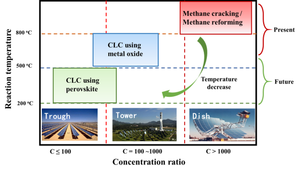 近年来,聚光太阳能利用逐渐成为能源领域中的国际前沿热点,太阳能热化学循环制取太阳能燃料被认为是具有发展前景的聚光太阳能热利用方式之一。聚光太阳能可实现不同聚光比条件下驱动碳氢燃料参与的化学反应和太阳能互补系统的燃料转化。太阳能燃料制备的主要问题在于热化学循环反应温度高、辐射热损失大、不可逆损失严重,导致能量转换效率低。为解决该问题,中国科学院工程热物理研究所分布式供能与可再生能源实验室研究人员提出聚光太阳能化学链循环方法。该方法的主要原理是:天然气在聚光太阳能作用下还原载氧体生成CO和H2,被还原的载氧体与空气等反应进行载氧体的再生,CO和H2即为所需的太阳能燃料。该方法可将热化学反应温度从1000oC以上降低至600oC左右,降低太阳能集热岛的辐射热损失和热化学反应的不可逆损失,具有将太阳能利用效率提升约5~10%的潜力。