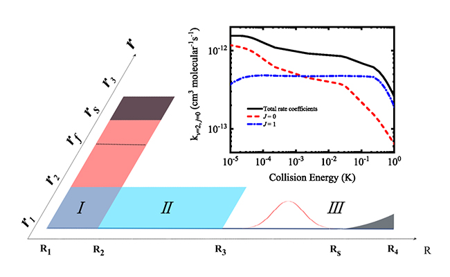 近年来,超冷(T<10-3K)分子的制备已经成为新的实验热点。在接近绝对零度的温度下,分子的德布罗意波长远大于相互作用的尺寸,量子效应会得到空前的增强,对超冷分子的研究对验证量子力学的基本理论有着重要意义。此外,由于超冷分子间的碰撞通常只涉及最低的相对轨道角动量分波,通过对超冷分子状态的精细调控,可以在高精度水平上探索化学反应的动力学和机理。自2010年美国科学院院士黛博拉·金(Deborah Jin)和叶军(Jun Ye)的联合实验小组观测到超冷的铷钾基态分子之间的化学反应(40K87Rb+40K87Rb→K2Rb2*→K2+Rb)以来,碱金属超冷分子—分子碰撞和化学反应的实验和理论研究取得了一系列重要进展。但由于通用的非含时量子动力学紧耦合(close coupling)方法的计算量随基函数的数目N呈N3增长,对这些超冷四原子反应的严格理论研究非常困难。