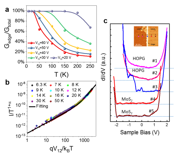 图a.二维材料边界电导比例与温度、栅压关系。图b.I/T1+α与qV/kBT关系。图c.STS能谱