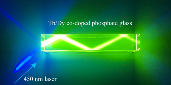 上海光机所高功率激光单元技术实验室合成的Tb3+/Dy3+共掺的磷酸盐玻璃。在450nm激光照射下磷酸盐玻璃Tb3+发射高亮度541nm荧光
