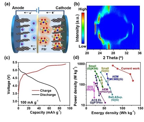 (a)钾基双石墨电池的结构以及工作机理示意图;(b)阴离子(FSI-)插层石墨正极的原位XRD表征; (c)钾基双石墨电池的充放电曲线;(d)与已有报道的能量及功率密度比较