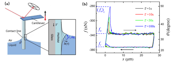 中国科学院力学研究所非线性力学国家重点实验室项目研究员关东石主要从事微纳尺度流体力学研究,利用新型悬针式原子力显微镜(图a),在研究微纳尺度下浸润动力学、接触角的迟滞和弛豫的微观力学机制等研究中取得进展(Guan et al. Phys. Rev. Lett. 116,066102 (2016) & Phys. Rev. E 94,042802 (2016))。在此基础上,研究人员通过在原子力显微镜探针的微棒上附着柔性聚合物,系统研究移动接触线在软物质表面上的动力学特征。实验中测得的毛细力迟滞环显示静态接触线在脱钉时呈现出力过冲(图b),且过冲幅度随保持时间和运动速度呈对数增长。通过建立力学模型,提出软表面上浸润脊的缓慢增长(老化现象)与布朗运动协助跨垒的共同影响,是移动接触线粘滑运动具有状态和速率依赖性的微观力学起源。