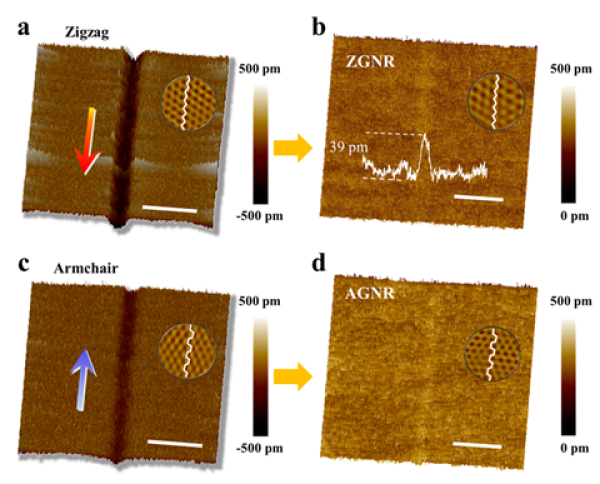 石墨烯纳米带(GNR)是一种准一维的石墨烯纳米结构,根据结构不同可表现出准金属或半导体特性。该特性取决于GNR的手性,包括宽度、晶格取向和边缘结构。根据不同的边缘结构,GNR可分为“锯齿型”(ZZ)和“扶手椅型”(AC)。GNR具有高迁移率和载流能力,且由于量子限域和边缘效应,其能够开启带隙。该特性使GNR有望成为包括纳米尺度场效应晶体管、自旋电子器件和片内互连线在内的候选材料。但在绝缘衬底表面,可控地制备具有边缘特异性的亚5纳米宽的GNR仍是难题。