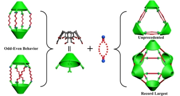中国科学院福建物质结构研究所结构化学国家重点实验室研究员袁大强课题组基于网格化学成功地构筑了三种不同类型的间环杯[4]芳烃基POCs,包括具有奇偶效应的[2+4]灯笼状有机笼,未见报道的[3+6]三棱柱状有机笼和迄今为止最大的[6+12]八面体有机笼。这些笼状化合物都是由相同的四醛基间环杯[4]芳烃与不同的二胺类连接体通过席夫碱反应组装而成,并且通过X射线结晶学、气体吸附测试、核磁共振氢谱和高分辨质谱对其结构进行了全面表征。特别需要指出的是,所制备的多孔有机笼的窗口直径能够连续由3.8提高到11.6