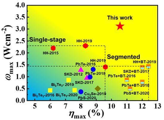 传统热电材料和器件研究方法是通过材料性能优化获得具有最高热电优值zT的热电材料,再基于该材料开展器件的结构设计,以期获得最佳的转换效率。这一研究思路将材料优化与器件设计分割成两个独立的阶段,即:材料研究追求高zT值,器件研究利用最高zT值的材料力求实现最高转换效率。由于最高zT值材料对应的电、热输运性能是通常是固定不变的,并且最高转换效率和最大功率密度对应的器件结构参数也不同,因此造成最佳功率密度和最佳转换效率无法在同一器件中同时实现。实际应用时,为了获得高转换效率,必须牺牲一定的功率密度,这也限制了热电器件的应用。