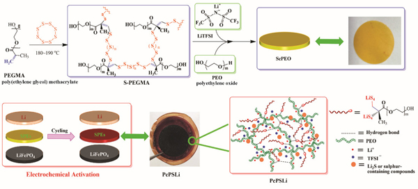 近期,金属所沈阳材料科学国家研究中心先进炭材料研究部新型电化学材料与器件团队在聚环氧乙烷基高性能电解质和固态电池方向取得了进展。针对聚环氧乙烷基固态电解质中锂离子电导率和迁移数较低的问题,利用多硫化锂的穿梭效应,通过原位电化学还原聚(乙二醇)甲基丙烯酸酯(PEGMA)与硫的共聚物,制备了-S4Li接枝的聚环氧乙烷固态电解质,从而实现快速的锂离子传输,并有效改善界面稳定性,使得全固态聚合物锂电池在50°C下表现出高达1200圈的超高循环稳定性。