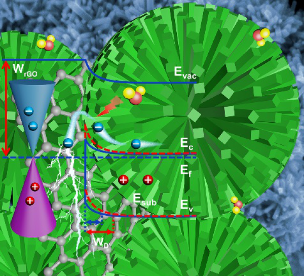 如何实现低浓度气氛(如NO2)的高灵敏度、高稳定、快速检测是具有挑战性的课题。研究人员受生物体内神经元的刺激响应过程启发,从感知和传导两个过程理解传感过程,并归属相应的材料调控策略,以具有表面超氧复合自由基缺陷的SnO2纳米花作为增强感知的基础材料,设计引入石墨烯构建内置微观肖特基结,通过肖特基结间电荷转移和高迁移率的石墨烯提高器件的电荷传导,开发出性能优异的NO2敏感材料。