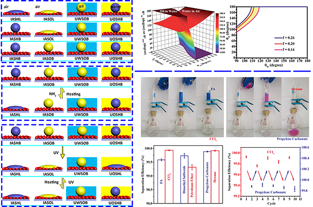 润湿性作为生物体和材料表面的重要特性,吸引了广泛的研究兴趣。基于仿生表界面的特殊润湿属性,人们开发了许多具有超疏液性质的功能材料表面。但目前发展的超疏液材料表面仅能够在单一的环境介质中表现其独特的疏液性质,比如鲨鱼皮肤表面仅能够在水下表现超疏油性质,在空气中油滴则会在干燥的表面快速铺展,从而失去防污功能。同时,目前发展的超润湿状态不仅局限于超疏水和水下超疏油两种状态,还存在新颖且更细分的润湿状态。因此,开发新颖的具有极端润湿特性的材料表面具有重要的研究意义。