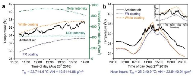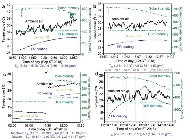 作者分别在两个铝板上涂了FR和白色涂层进行费尔德测试,以揭示荧光对SSRC的贡献。涂有FR涂层的铝板的平均温度比周围空气温度低3.3 ℃,而涂有白色涂层的铝板的平均温度仍然保持略高于环境空气温度。在FR涂层观察到的显着的低于室温的冷却效果,揭示了中午由荧光所贡献的净冷却能力。在夜间、清晨和午后,它们的温度几乎重叠并且明显低于环境空气温度,表明仅当太阳光强度高于某个阈值时才发生荧光冷却。两组结果说明,在观察到的SSRC效应中荧光发射的深刻作用。