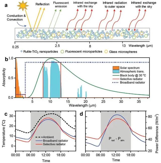 现有设备由于夜间热量输入较少,其夜间降温能力比白天强得多,可能会导致昼夜温差增大,从而危及建筑围护结构的使用寿命。此外,是否可以对商业化建筑涂料进行工程设计,实现增强的日间亚环境冷却而抑制夜间冷却,即智能型亚环境辐射冷却(SSRC)。但是,传统的TiO2基屋顶涂料的太阳反射率为85%,无法满足SDRC的严格要求。因此,开发新的物理概念来设计这些传统建筑涂料是实现SSRC的一种有前途的途径。