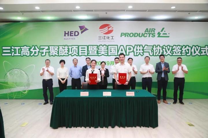 9月17日上午,海盐举行三江高分子聚醚项目暨美国空气产品供气协议签约仪式,总投资3亿美元的三江高分子聚醚项目正式落户海盐经济开发区,三江化工和美国空气产品公司将强强联手,聚焦氢能源上下游产业链建链、补链、强链,打造“中国氢谷”。