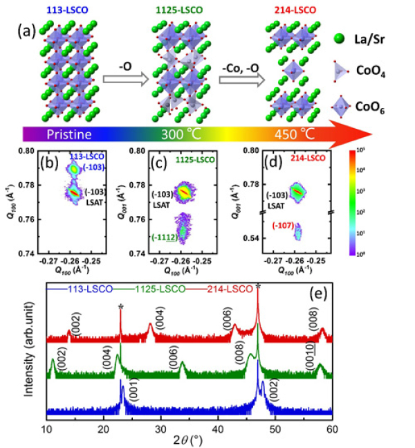 图1、(a) La0.7Sr0.3CoO3(113-LSCO), La0.7Sr0.3CoO2.5(1125-LSCO)和La1.4Sr0.6CoO4(214-LSCO)相的晶体结构模型示意图. (b)113-LSCO, (c) 1125-LSCO and (d) 214-LSCO 薄膜的倒易空间图. (e) 113-LSCO (blue), 1125-LSCO (green) and 214-LSCO(red)薄膜的XRD θ-2θ扫描图谱.
