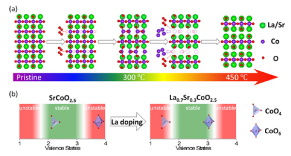 图2、(a) 三态拓扑相变过程中Co离子和氧离子的迁移示意图,(b) A位La掺杂对Co离子价态及CoO4四面体和CoO6八面体相对稳定性的影响。