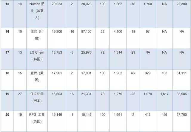 榜单中前五名之外,并购活动继续影响排行榜。重组后杜邦公司在榜单上排名第13位,而陶氏杜邦公司(DowDuPont)农化业务剥离成立的科迪华公司(Corteva)首度排名第25位。而都有大量农化业务的拜耳和中国化工排名都高于科迪华公司,中国化工在榜单中居第八,拜耳位居第十二名。2019年也是林德与普莱克斯合并后的第一个全年业绩,新林德公司在排行榜中排名第十,而工业气体竞争对手液空集团(Air Liquide)排名第十一位。
