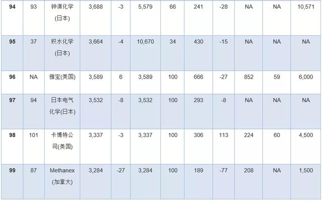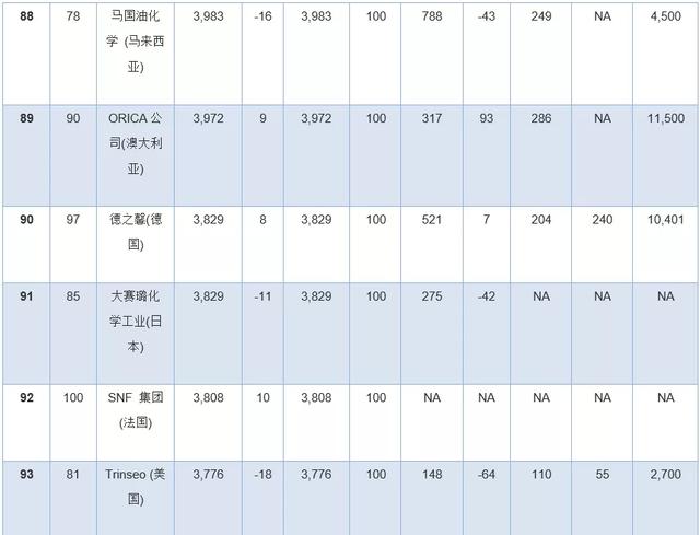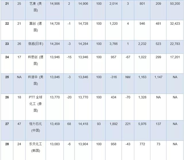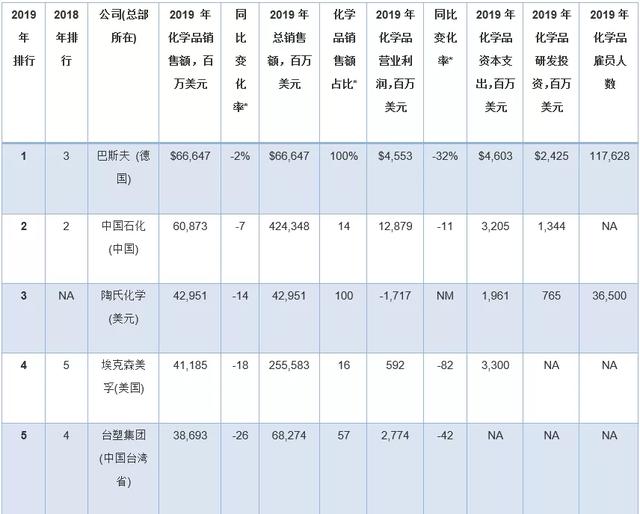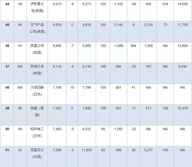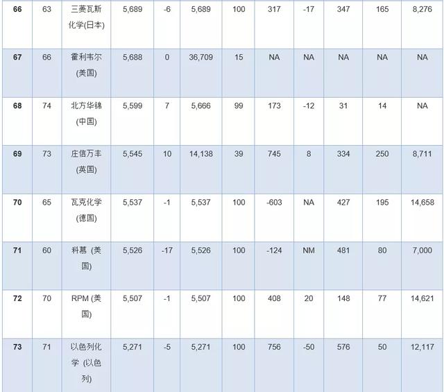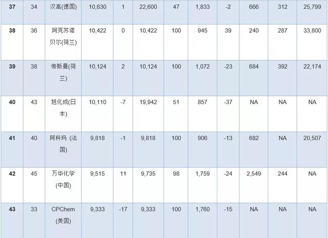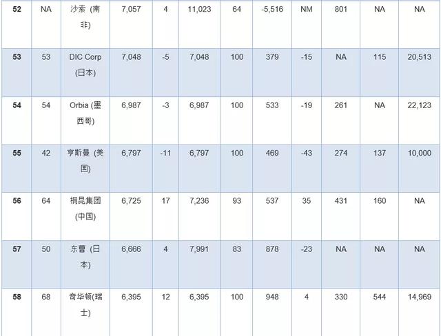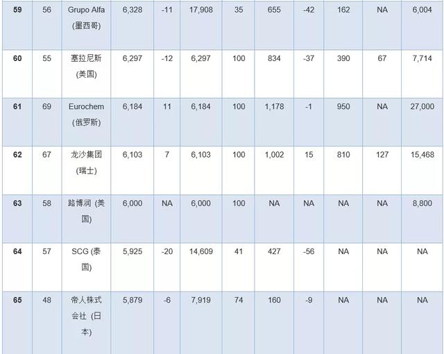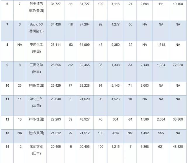 此外,几家拥有大量化学品业务的公司因为没有全面公开报告化学品收入,所以未能参加本年度排行榜。其中包括英力士、科赫工业、壳牌、道达尔和中国石油(PetroChina)。