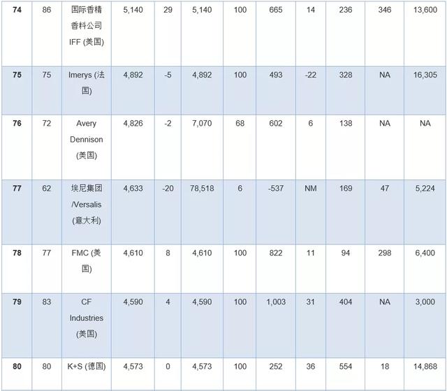 在过去的几年里,公司并购还对本排行榜产生了另一个影响——入榜公司数量有所减少。尽管陶氏杜邦公司被拆分为三家,但由于资产剥离等原因历史上销售收入达30亿美元左右的公司,如亚仕兰和普立万,在本年度排名中退至100名以后。