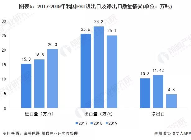 目前,我国聚酯PBT基本满足国内需求并实现净出口。根据海关总署数据显示,2019年我国聚酯PBT进口20.3万吨,出口25.1万吨,净出口4.8万吨。
