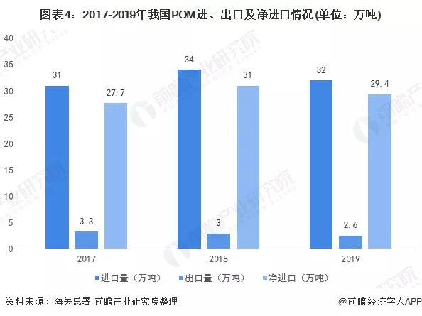 根据海关总署数据显示,2019年POM进口量约32万吨,出口量为2.6万吨;净进口量为29.4万吨。主要是由于中国目前不能生产一些特殊级别的聚甲醛,这些产品仍将继续依赖进口,而一些通用牌号产品的出口或将增加,因此中国同时也是世界最大的聚甲醛净进口国。