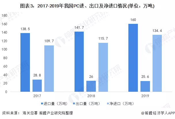 根据海关总署数据显示,2019年PC进口量约160万吨,出口量为25.6万吨;净进口量为134.4万吨。总体来看,我国PC需求缺口仍较大。