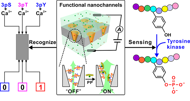 该团队通过模仿蛋白质中精氨酸与酪氨酸磷酸盐残基的相互作用,设计了含多胍基的智能聚合物,并将其修饰到锥形纳米孔道内,制备出一种功能离子通道器件。研究发现,聚合物可以依托胍基识别磷酸化肽的磷酸化残基,且能将这种分子层面的识别作用放大到聚合物构象的变化上,并进一步被转换为通道离子电流的“OFF-ON”变化,实现对磷酸化肽的精确检测。此外,当引入钙离子作为磷酸盐的一个竞争性结合成分时,该离子通道通过简单的纳流控逻辑门运算,即可大幅度提高对酪氨酸磷酸化肽检测的选择性。借助于对磷酸化肽的识别,该离子通道器件能够用于实时监测酪氨酸激酶催化下的酪氨酸磷酸化反应,并且在监测模型抑制剂对酪氨酸激酶活性的抑制实验中,该方法具有用于激酶抑制剂筛选的潜力。