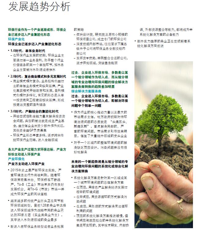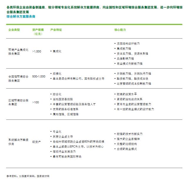 环保行业作为一个产业逐渐成形,环保企业已逐步迈入产业集团化形态。过去,企业进入环保市场,多数是以某一个细分领域作为切入点,而从细分领域的专业治理向环保问题的综合解决方案服务商转换的趋势愈加明显。各类环保企业由装备制造商、细分领域专业化系统解决方案提供商,向全国性和区域环境综合服务集团发展,进一步向环境综合服务集团发展。
