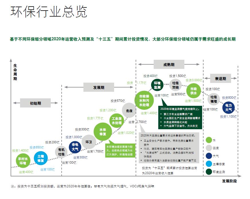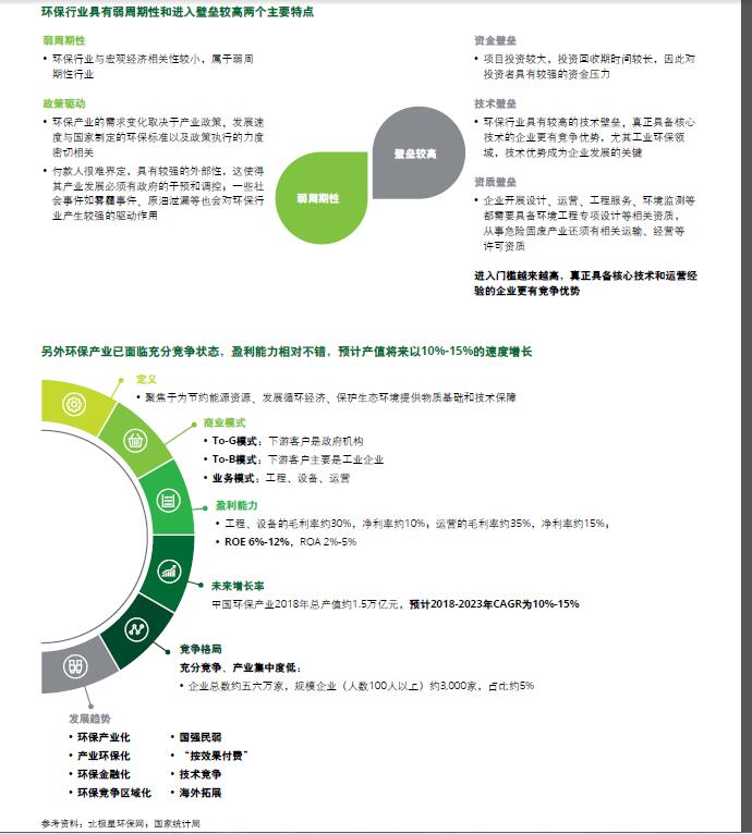 基于不同环保细分领域2020年运营收入预测及“十三五”期间累计投资情况,大部分环保细分领域仍属于需求旺盛的成长期。环保行业具有弱周期性和进入壁垒较高两个主要特点,此外环保产业已面临充分竞争状态,盈利能力相对不错,预计产值将来以10%-15%的速度增长。