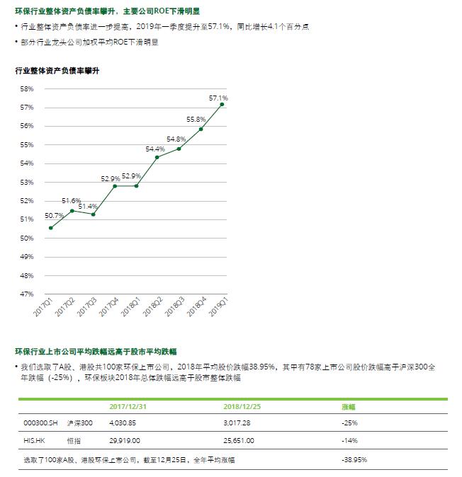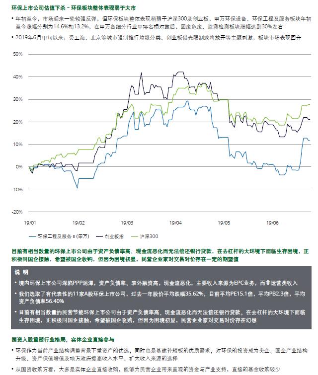 环保行业整体资产负债率攀升,主要公司ROE下滑明显,环保行业上市公司平均跌幅远高于股市平均跌幅。目前有相当数量的环保上市公司由于资产负债率高、现金流恶化而无法偿还银行贷款,在去杠杆的大环境下面临生存困境,正积极同国企接触,希望被国企收购,但因为困境初显,民营企业家对交易对价存在一定的期望值。