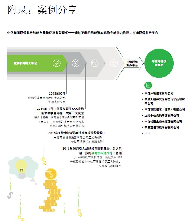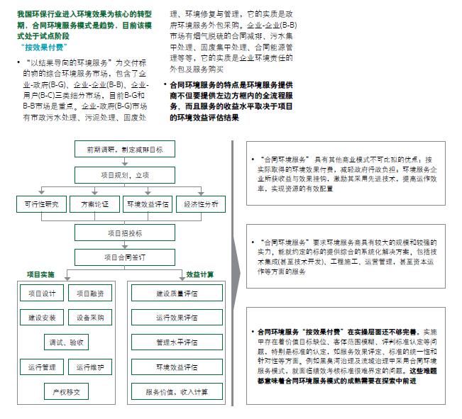 金融资本不断向环保产业渗透,环保企业借助金融资本的力量不断发展壮大,全国范围内竞争热度呈区域化特征,领先的环保企业均形成了区域化布局。我国环保行业进入环境效果为核心的转型期,合同环境服务模式是趋势,目前该模式处于试点阶段。