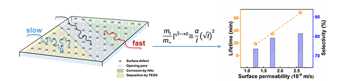 该团队利用化学液相沉积法与酸蚀技术修饰了SAPO-34分子筛的晶体外表面。根据前期所提出的表面渗透率公式,该团队直接测定了修饰前后的分子筛的表面渗透率,定量得到了分子筛的表面传质阻力。与此同时,采用该方法修饰分子筛外表面过程中,分子筛形貌、内部孔道结构、酸性质与晶内扩散性质几乎不变。研究发现,控制相关客体分子在分子筛晶体上的表面传质能力,降低其表面阻力,有助于加快客体分子进出分子筛晶体,最终实现延长分子筛寿命,提高低碳烯烃选择性。
