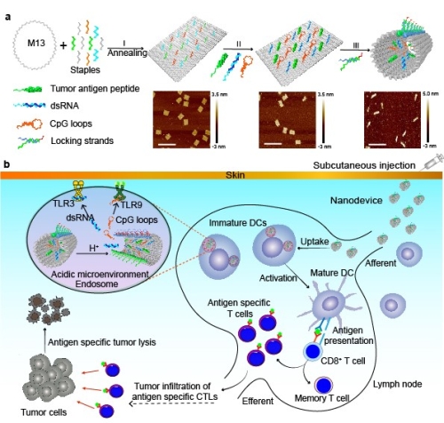 (a)DNA折纸构建肿瘤抗原肽/ CpG环/ dsRNA共同负载的纳米机器肿瘤疫苗示意图