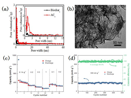 生物炭理化特性及碳锂离子电池特性:(a)BET, (b)TEM,(c)电流对吸放电影响,(d)恒电流下吸放电和库伦效率