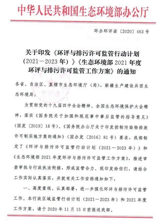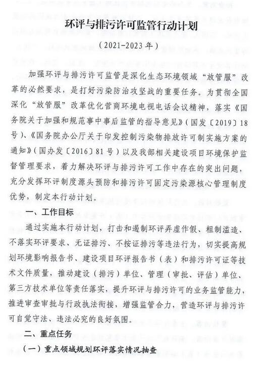 生态环境部近期印发《环评与排污许可监管行动计划(2021-2023年)》,就相关工作进行部署。要求各级生态环境部门高度重视、认真部署,制定并组织实施本行政区域监管行动计划和2021年度工作方案。
