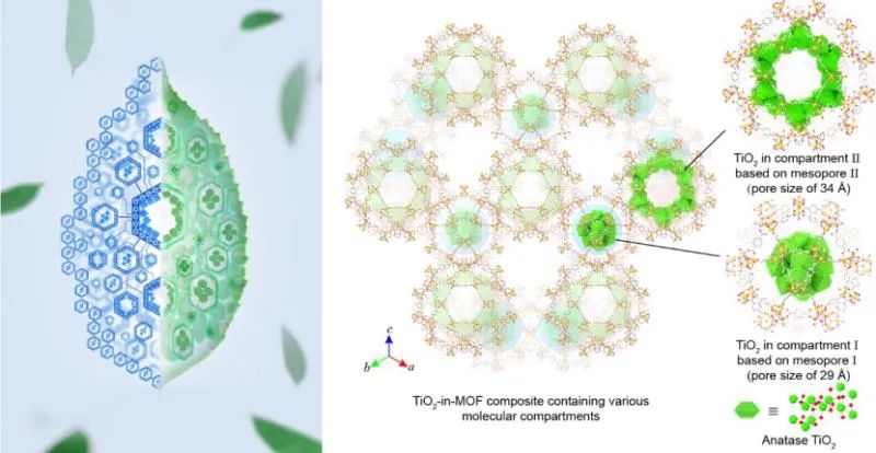 研究表明在II型隔间中的TiO2比I型隔间中的TiO2催化性能高44倍,揭示了介孔微环境对催化活性的影响。值得一提的是,半导体纳米材料与MOF在其孔道中的精确排布并未破坏MOF的局域有序结构。两种材料特性的高效协同,将能拓展出一系列新型的人工光合作用催化剂,有望推动在光吸收波长范围以及量子产率上的更大突破。