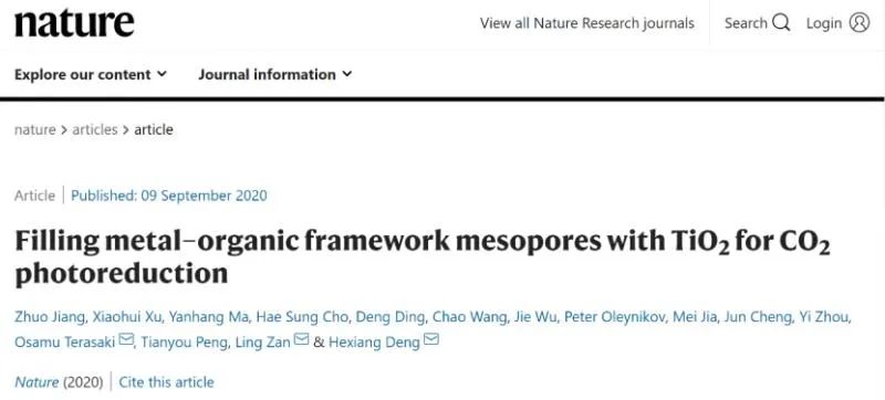 论文题为“二氧化钛在金属有机框架中介孔的填充及二氧化碳光还原”(Filling metal–organic framework mesopores with TiO2 for CO2 photoreduction)。第一署名单位为武汉大学,化学与分子科学学院博士后江卓和2015级博士徐晓晖为共同第一作者,武汉大学邓鹤翔教授、昝菱教授,上海科技大学Osamu Terasaki教授为共同通讯作者。