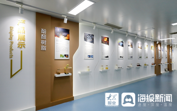 在山东圣泉新材料股份有限公司产品展厅,圣泉集团副总裁唐磊向大众网·海报新闻记者一一展示着依托酚醛树脂研发的一系列高端复合材料。