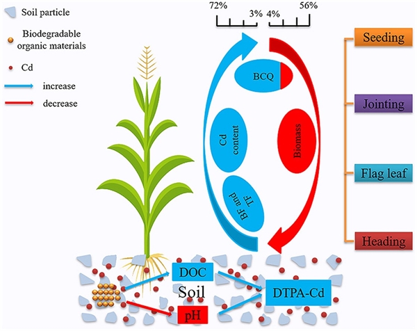 镉污染农田在全球广泛分布,其修复治理备受关注。植物吸取是一种成本低廉、环境友好的修复手段,但镉超富集植物的生物量一般较小,限制了修复效率。近年来,科学家在生物量较大的能源植物、纤维植物等用于镉污染农田修复方面开展了丰富研究,但其镉富集能力相对较弱是重要限制因子。通过施加重金属螯合剂强化植物吸取修复效率成为该领域的研究热点之一。低分子有机酸、可溶性有机物料降解周期短,是一类环境友好型螯合剂,如何在有限的降解周期内,提升其强化作物吸取镉的效应研究具有实用价值。