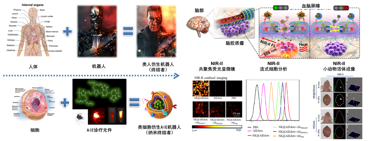 基于前期NK细胞膜仿生纳米载体系统的工作基础(ACS Nano 2018, 12, 12, 12096-12108),通过借鉴科幻电影《终结者》中终结者机器人T-800的设计理念,粤港两地研究人员合作开发了以AIE聚合物材料为内骨骼,以自然杀伤细胞膜为外部皮肤的“终结者”纳米机器人系统,这一系统既保留了AIE材料在聚集态的优越的近红外二区发光性能,同时赋予了AIE材料自然杀伤细胞免疫调节与识别的功能。所构建的纳米机器人可以通过调控血脑屏障表皮细胞间的紧密连接(TJs),引发血-脑屏障细胞骨架重排,导致细胞间隙增大而形成细胞间“绿色通道”,帮助自己穿越血脑屏障。在跨越血脑屏障进入脑部区域后,这些纳米机器人可以利用NK细胞膜表面蛋白与肿瘤细胞膜表面受体的特异性识别富集到脑胶质瘤细胞内。
