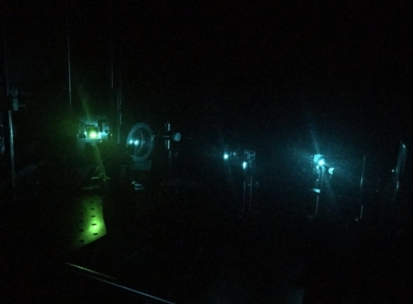 工作条件下的室温连续激发准二维钙钛矿激光器(蓝色为光泵浦源488nm固体激光器光路,绿色为钙钛矿激光器及激光)