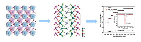 中国科学院福建物质结构研究所光电材料化学与物理重点实验室叶宁研究团队,将能够有效增大带隙、提高损伤阈值的F-离子和对能够增大晶体结构极性的Bi3+离子引入碘酸根体系,设计合成具有大倍频效应和高损伤阈值的(NH4)Bi2(IO3)2F5非线性光学晶体。该晶体的倍频效应是KDP的9.2倍,损伤阈值是AgGaS2的40.2倍。该晶体具有合适的双折射率(0.0690@589.3nm),能够实现相位匹配。此外,通过NH4+离子的引入可以增强层间作用,并降低晶体的生长温度。