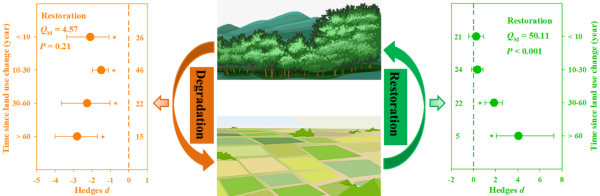 中国科学院武汉植物园科研人员通过数据整合分析(meta-analysis),收集到已发表的83篇关于植被退化和恢复对甲烷氧化影响的研究论文,从全球角度分析土壤甲烷氧化潜力对植被退化和恢复的响应。研究表明,土壤甲烷氧化对植被退化和恢复的响应是非对称的,主要表现在两个方面:植被退化导致的土壤甲烷氧化降低幅度大于植被恢复使土壤甲烷氧化潜力提升的幅度;土壤甲烷氧化潜力在短期的植被退化背景下降低,且植被退化对甲烷氧化潜力的负效应不随退化年限增加而改变,但土壤甲烷氧化潜力随植被恢复时间增加而增加,短期的植被恢复(< 30 years)不足以提升甲烷氧化潜力。该研究为可持续的土地管理提供参考,有助于减少土壤甲烷氧化潜力对全球土地利用变化响应的不确定性。