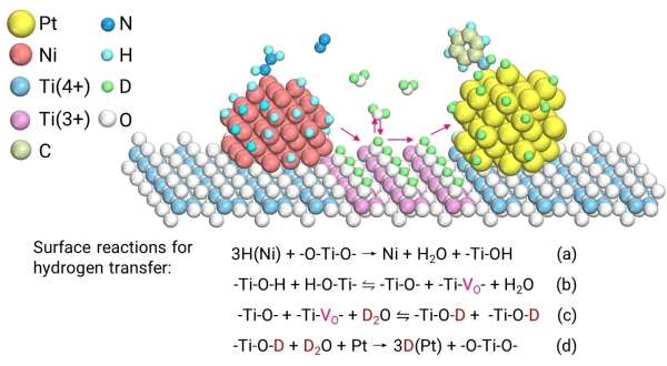 镍层仅能催化水合肼分解制氢,铂层则仅催化硝基苯加氢,以水相中水合肼分解制氢和硝基苯加氢串联反应作为探针反应来揭示串联催化的间距效应。与单金属、机械混合以及管套管等催化剂相比,五夹层催化剂显示出优异的串联活性。铂镍间距越小,串联性能越高。与其他ZnO和Al2O3相比,采用TiO2为过渡层时催化剂能够促进活性氢的传递,具有更高的性能。重水同位素实验表明,水参与的过渡层上活性氢的传递为串联催化的决速步骤。间距越小,过渡层上活性氢物种传递的位点越多(低价的氧化钛和氧缺陷位点),更有利于促进氢原子的传递和提高串联催化效率(图3)。