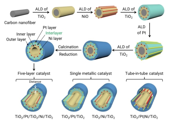 利用模板辅助的原子层沉积方法设计出TiO2/Pt/xTiO2/Ni/TiO2多孔五夹层催化剂(图1)。通过改变过渡层氧化物的厚度(或沉积循环数)可实现Ni和Pt层间距的精准控制。改变沉积物种可得TiO2/Ni/TiO2和TiO2/Pt/TiO2单金属催化剂及TiO2/Pt|Ni/TiO2管套管催化剂。