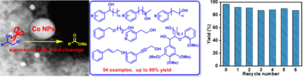 研究团队通过模板法制备氮掺杂多孔碳负载的钴基催化剂Co-NC-900,在氧气氛围下,将其用于催化醇类化合物C-C断裂合成酯。该方法对各种芳香类、脂肪类、杂环类、烯丙基类、炔丙基类伯醇和仲醇,以及木质素模型化合物均可适用,不仅能够断裂C(OH)-C键,而且能实现相邻-(C-C)n-的连续断裂。该反应的底物范围较广,且催化剂循环使用7次活性无明显下降,具有合成价值。催化剂表征结合KSCN中毒实验表明,材料中石墨烯包裹的钴纳米粒子对C-C键断裂优异的催化活性起重要作用,而Co-Nx的存在则有相反的效果。研究人员通过对比实验和动力学实验,对氧化断裂反应过程进行研究,发现该催化过程顺次发生逐步氧化、亲核加成和C-C键断裂。该研究将氮掺杂多孔碳材料应用于醇类化合物的C-C键氧化断裂直接制备酯,为C-C键氧化断裂提供新策略。