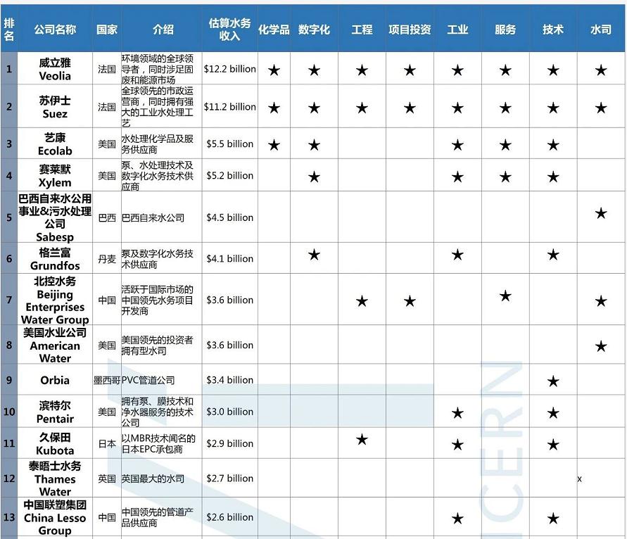 从榜单中可以看出,在水务领域,法国拥有最大的私营水务运营商,美国拥有最大的工程和技术公司,巴西拥有最大的私营水务特许经营商,英国拥有TOP40榜单中最大的受监管类水司,而中国也有多个实力不俗的项目开发商位列其中,包括北控水务、首创集团、碧水源、粤海投资等。以水务板块的收入进行排名,榜单中只有前两名才有资格跻身《财富》美国500强排行榜,到目前为止,水务行业仍然是一个很难真正获得大笔收入的生意。