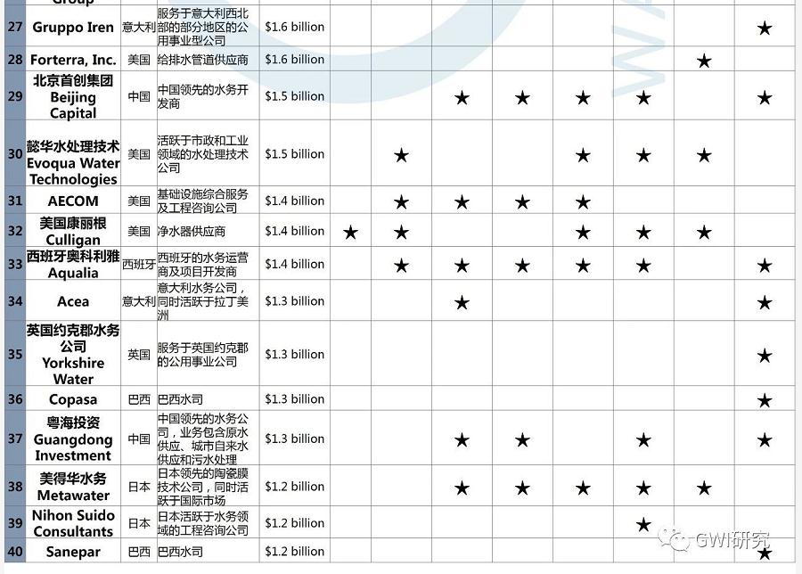 今天GWI将带给您全球活跃于水务行业的营收前40的企业榜单,榜单中的营收为公司在水务板块的收入(部分为估算数据)。