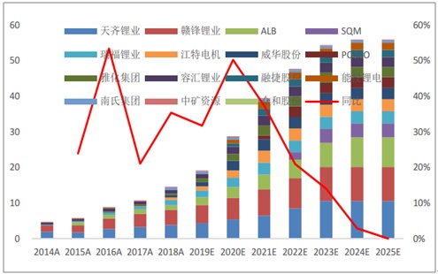 截止2019年,全球已有产能39万吨,在建产能19万吨,规划产能20万吨,到2025年达到79万吨。其中,ALB、天齐和赣锋料将成为最大的三家锂盐冶炼生产商。