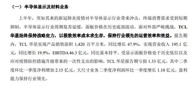 总体而言,上半年TCL华星大尺寸产线已实现盈利,目前大尺寸面板价格企稳回升,中小尺寸快速改善,下半年业绩整体将持续向好。