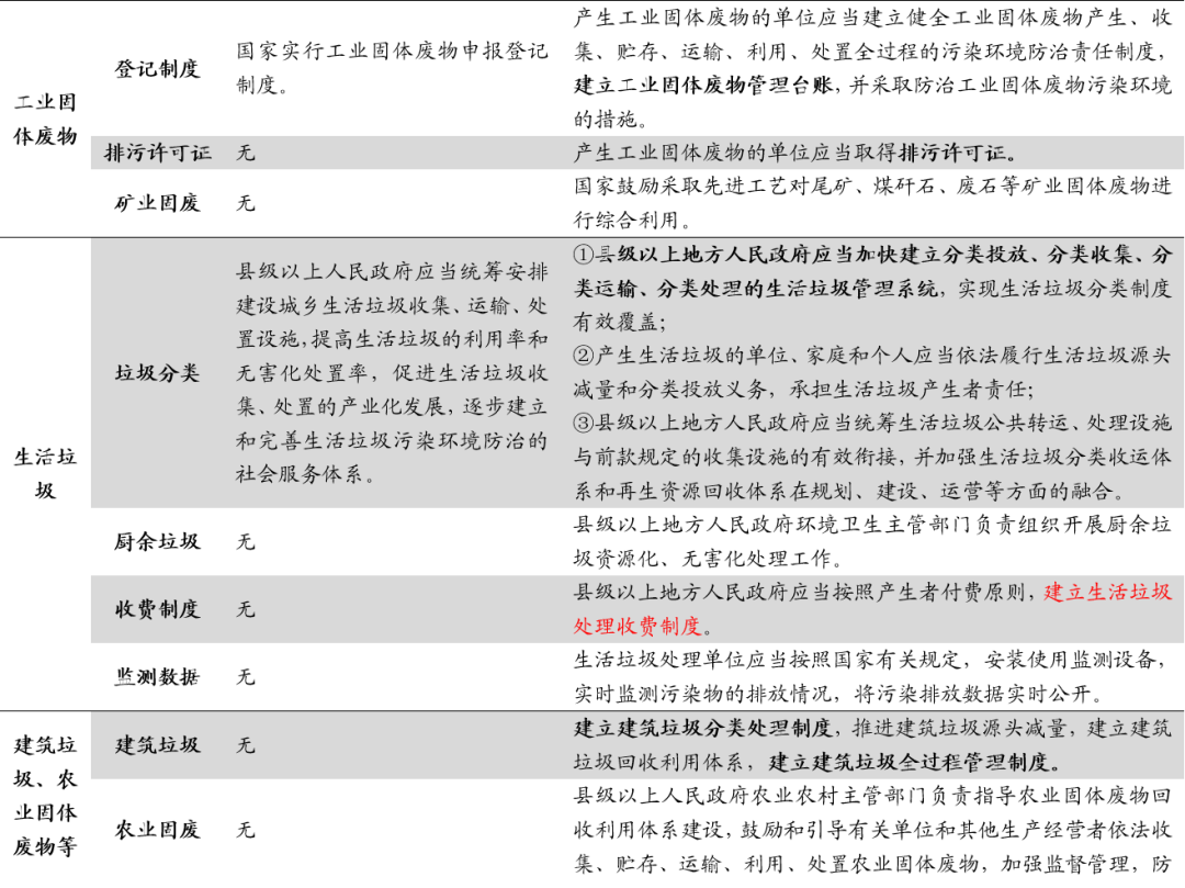 垃圾分类方面:推行生活垃圾分类制度,建立差别化生活垃圾处理收费制度。将垃圾分类写入新固废法中,明确责任主体和收费制度,解决政策端和费用端两大限制问题,为垃圾分类的顺利开展提供保障。具体来看,1)新固废法提出国家推行生活垃圾分类制度,要求县级以上地方人民政府应当加快建立分类投放、分类收集、分类运输、分类处理的生活垃圾管理系统,实现生活垃圾分类制度有效覆盖;2)县级以上地方人民政府应当按照产生者付费原则,建立生活垃圾处理收费制度,县级以上地方人民政府制定生活垃圾处理收费标准,应当根据本地实际,结合生活垃圾分类情况,体现分类计价、计量收费等差别化管理。